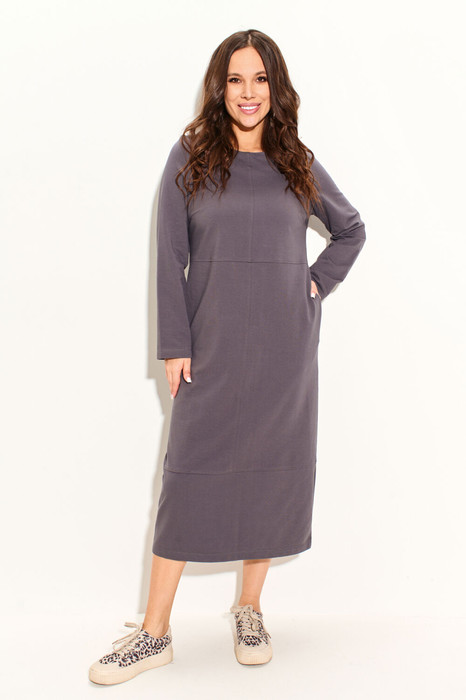 Стильное женское платье полуприлегающего силуэта со втачными рукавами выполнено из мягкого трикотажа футер 2-х нитка класс "пенье". По переду отделочные строчки, в боковом шве разрез. Изделие  полностью соответсвует заявленному размеру. Пожалуйста, пользуйтесь таблицей обмеров готового изделия.