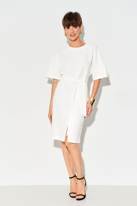 Классическое женское платье полуприлегающего силуэта выполнено из плательной ткани с содержанием вискозы. По переду небольшой декоративный разрез; вырез горловины круглой формы; рукава со спущенной линией плеча; по спинке застёжка на молнию. В комлекте съёмный пояс из основной ткани. Платье полностью соответствует заявленному размеру. Пожалуйста, пользуйтесь таблицей обмеров готового изделия.