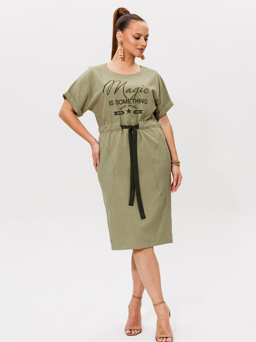 Платье женское,выполнено из текстильного полотна костюмно-плательной группы. Платье длиной немного ниже колена, прямого силуэта, зауженного к низу. Рукав цельнокроенный, короткий с манжетой. Горловина круглая. На уровне линии талии расположена кулиска с протянутым в нее мягким поясом отделочного цвета. Такого же цвета деталь кармана, расположенного у бокового шва. По центру переда имеется печать в цвет отделки. Изделие дополнено мнталлическим украшением расположенном на одном из карманов.
