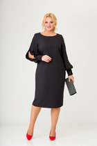 Платье женское прямого силуэта, зауженное к низу, отрезное по талии, с округлым вырезом горловины и втачными рукавами. Полочка оформлена застроченым складками и пришивным украшением. Баска и рукава выполнены из красивого гипюра в цвет основной ткани.