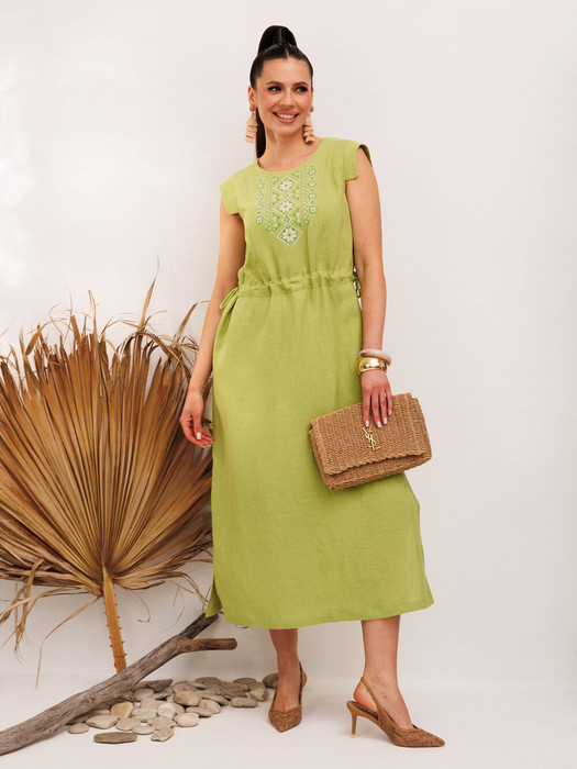 Платье женское прямого силуэта выполнено из льняной ткани с добавлением вискозы. Горловина круглая с застежкой на спинке на пуговицу. Рукав фантазийной формы. На центральной детали переда расположена вышивка в народном стиле. На талии настрочены короткие кулиски по центру спинки и переда, в которые продет декоративный шнур. В боковых швах по низу имеются разрезы по обеим сторонам.