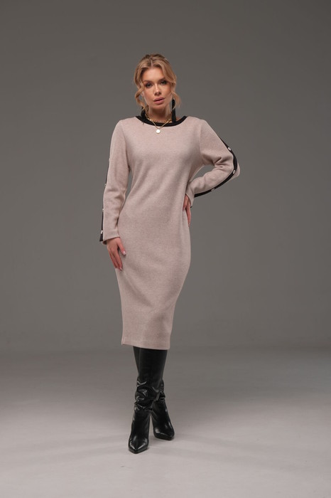 Платье женское полуприлегающего силуэта из трикотажной ткани двух цветов.Спинка со средним швом заканчивающаяся разрезом.Горловина круглая. Рукава гладкие с имитацией планки. На планке пришиты декоративные пуговицы.