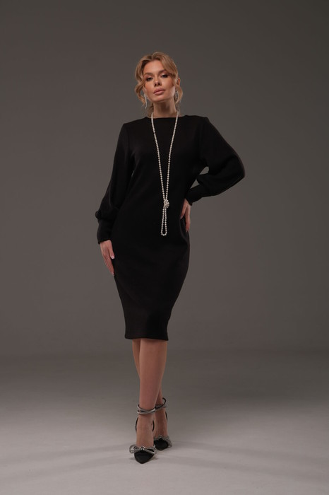 Платье женское прилегающего силуэта из трикотажной ткани.По переду горловина лодочкой. Спинка со средним швом, заканчивающаяся разрезом.