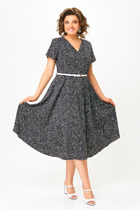 Платье слегка приталеного силуэта. Рукав втачной одношовный. Воротник небольшая цельнокроенная стойка. По переду - нагрудная вытачка, выходящая из бокового шва. По линиям втачивания рукавов спереди - фигурный вырез. Длина платья по середине спинки - 116 см, длина рукава - 63см.