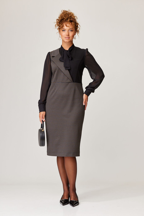 Платье полуприлегающего силуэта из трикотажа средней плотности, отрезное по линии талии. Правая часть переда имитирует жакет с воротником пиджачного типа. Левая часть переда имитирует блузку с воротником стойкой переходящем в бант. В правой и левой части рельефы. Нижняя часть переда с талиевыми вытачками. Спинка со средним швом и талиевыми вытачками. Внизу среднего шва шлица. Рукав втачной одношовный со сборкой по окату и по линии притачивания манжеты. Манжета застегивается на 3 петли и пуговицы. Рукава и бант выполнены из шифона. Длина платья - 107 см, длина рукава - 64 см.