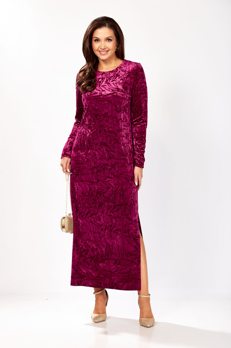 Платье прямого силуэта из бархата.  В боковом шве разрез. Рукав втачной одношовный. По спинке застежка капелька на петлю и пуговицу.  Длина  платья - 136 см, длина рукава -  66 см.