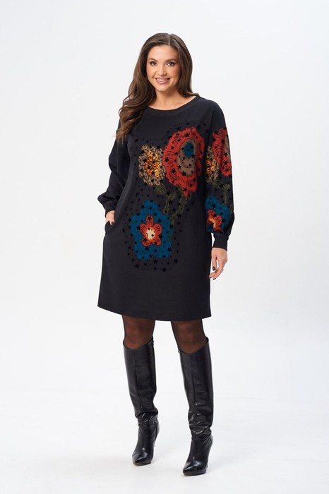 Платье свободного силуэта из трикотажной ткани с принтом. Рукав втачной одношовный со складками по низу и манжетой. В боковых швах карманы. Горловина обработана планкой в форме лодочки. По переду в в ерхней части настрочена сетка. Длина платья - 91 см , длина рукава платья - 53 см.