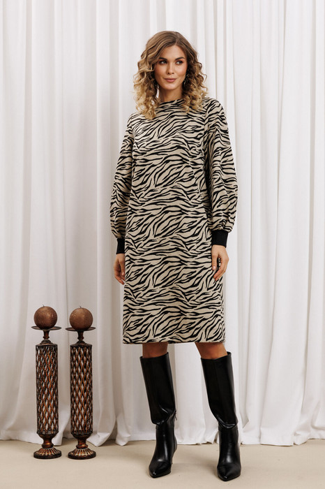 Платье прямого силуэта из плотного трикотажного полотна. Перед с нагрудными вытачками. Спинка со средним швом. Горловина лодочкой обработана планкой. Рукав одношовный втачной по низу со складками собранными на манжету-довяз. Длина платья-100см, длина рукава-60см.