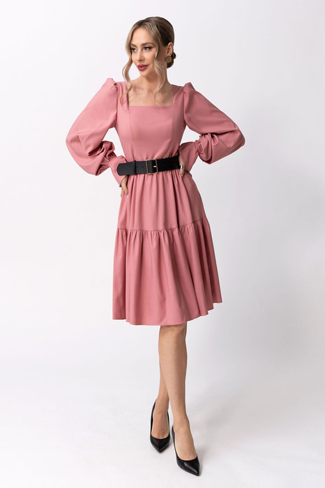 Платье, с застежкой на потайную молнию по среднему шву спинки, без воротника, с фигурным вырезом горловины. Платье отрезное по линии талии. Нижняя часть платья состоит из двух воланов. Лиф переда с рельефами, выходящими из горловины. Лиф спинки со средним швом, рельефами, выходящими из горловины. Рукав втачной, длинный, с отрезной манжетой. Окат и шов притачивания манжеты присборен. Платье со съемным поясом.