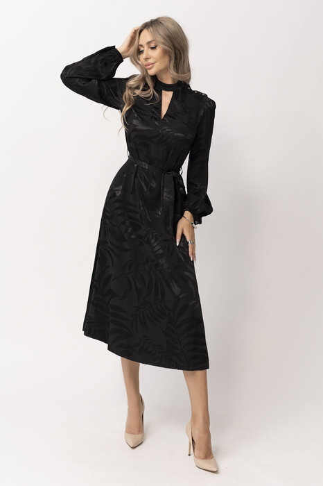 Платье полуприлегающего силуэта, расширенное к низу, c втачным воротником- стойкой, застегивающейся по левому плечу на петли и пуговицы. По переду со средним швом и нагрудными вытачками. По горловине переда- V-образный вырез. Спинка со средним швом. По боковым швам расположены разрезы. Рукав втачной, длинный, со сборкой по окату. По низу рукава- отрезная манжета, по шву притачивания манжеты- сборка. Платье со съемным поясом.