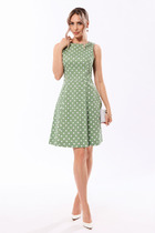 Платье с застежкой на потайную молнию в среднем шве спинки, без воротника, с круглым вырезом горловины, без рукавов. По переду с талиевыми вытачками. Платье отрезное по линии талии. Нижняя часть переда и спинки расклешенная, с двумя рельефными швами. Спинка со средним швом.