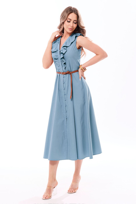 Платье с центральной застежкой на навесные петли и пуговицы по притачной планке, без воротника, без рукавов, с V-образным вырезом горловины. Платье отрезное по линии талии. По лифу переда, вдоль горловины и планки расположена рюша. Лиф спинки с талиевыми вытачками. Нижняя часть спинки со средним швом. По боковым швам расположены шлевки для съемного пояса. Платье со съемным поясом.