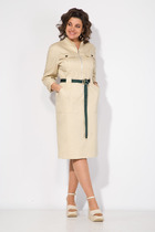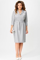 Платье, с центральной двубортной застежкой на пришивные кнопки, с отложным воротником и лацканами. Верхняя часть переда с нагрудными вытачками. Верхняя часть спинки со средним швом и талиевыми вытачками .Нижняя часть переда и спинки расклешенная. Низ переда закладывается в односторонние складки. Шов по талии присборен на резинку. Рукав втачной, короткий, с отложной манжетой. Платье со съемным поясом.