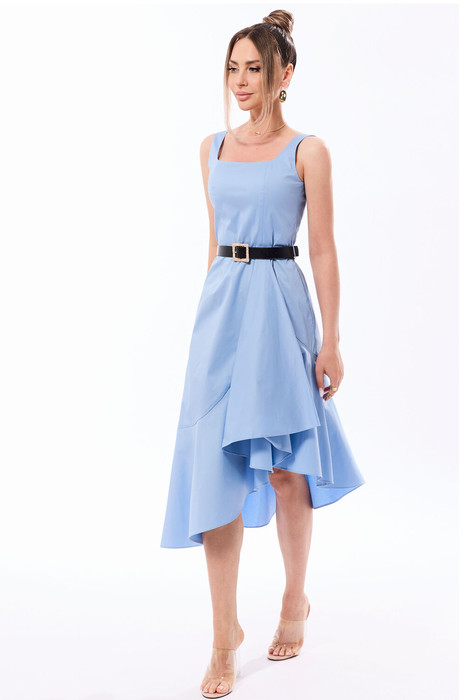 Платье без воротника, без рукавов, с фигурным вырезом горловины, с застежкой на потайную молнию в среднем шве спинки. Платье отрезное по линии талии. По лифу переда с рельефами, выходящими из горловины. Спинка со средним швом, по лифу спинки с рельефами, выходящими из горловины. Нижняя часть платья с отрезным фигурным воланом, закрепленным в виде складки по талиевому шву. Платье со съемным поясом.