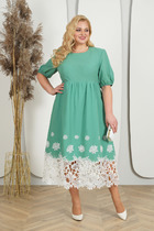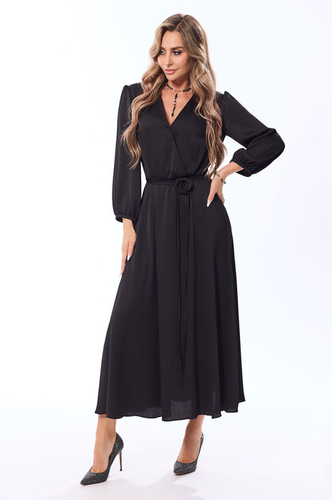 Платье, без воротника, без застежки, отрезное по линии талии. Лиф переда с запахом. Талия собрана на резинку. Верхняя часть спинки с талиевыми вытачками. Нижняя часть платья расширена к низу. Рукав втачной, 3/4, с манжетой, присборенной на резинку. Платье со съемным декоративны поясом из основной ткани и декоративным цветком на поясе.