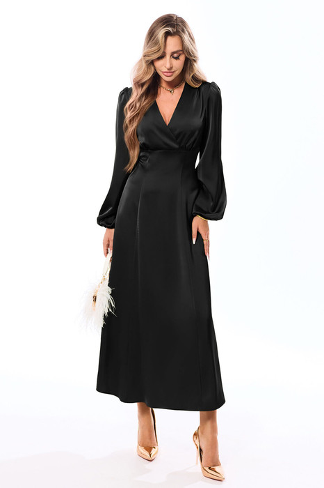 Платье, без воротника, с V-образным вырезом горловины, застежкой на потайную молнию в левом боковом шве. Платье отрезное по линии талии. Лиф переда с деталями на запах, со сборкой по плечевым и нижнему швам. Лиф спинки с частичной сборкой по низу. Рукав длинный, втачной, с отрезной манжетой, присборенной на резинку. Окат рукава со сборкой. Нижняя часть платья с двумя рельефными швами. Нижняя часть спинки со средним швом, двумя рельефными швами.