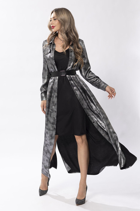 Платье с центральной застежкой на петли и пуговицы, втачным воротником с отрезной стойкой. По переду с клапанами. Спинка с отрезной кокеткой, переходящей на перед. Платье двойное. Нижнее платье на бретелях, с нагрудными вытачками по переду. Платье со съемным поясом.