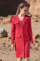 Платье без воротника, без застежки, полочки зафиксированы поясом- завязкой, на уровне груди полочки зафиксированы пришивной кнопкой. Платье отрезное по линии талии. Верхняя часть полочек с нагрудными вытачками. Верхняя часть спинки с талиевыми вытачками. Нижняя часть платья расклешенная. Рукав длинный, с отрезной манжетой. Окат и низ рукава присборен. Платье со съемным поясом.