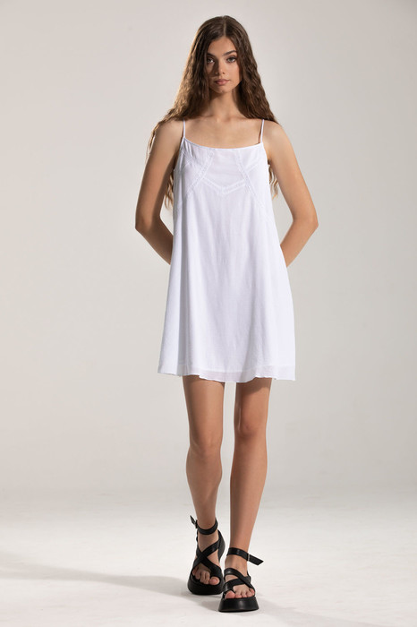 Платье A-образного силуэта, без рукавов, без застежки, на бретелях. Длина бретелей регулируется. Перед состоит из втачных фигурных деталей с кружевом. Спинка со средним швом. Платье на подкладке.