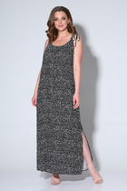 Платье с центральной застежкой на петли и пуговицы, без воротника, с круглым вырезом горловины. По боковым швам- разрезы. Плечевые швы переходящие на перед. По плечевым швам расположены паты, закрепленные петлей и пуговицей. Платье со съемным поясом, закрепленным шлевками по боковым швам. Рукав втачной, длинный, с отрезной манжетой.
