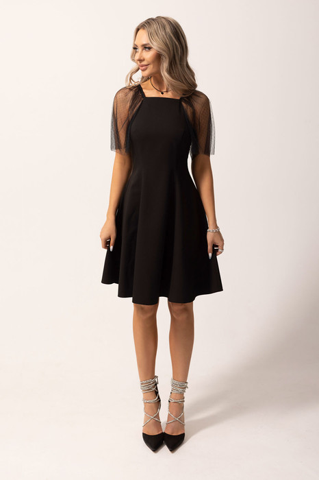 Платье без воротника, с квадратным вырезом горловины, застежкой на потайную молнию в среднем шве спинки. По переду с рельефами, выходящими из проймы. Спинка со средним швом, рельефами, выходящими из проймы. Рукав реглан, крылышко. Верхняя часть рукава присборена на резинку.