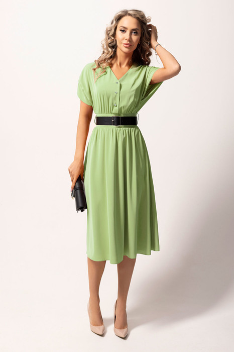Платье полуприлегающего силуэта, без воротника, с V-образным вырезом горловины, с центральной застежкой на петли и пуговицы по лифу переда. Платье с втачным поясом. По спинке пояс присборен на венгерку. По переду лиф и юбка присборены по шву притачивания к поясу. В боковых швах расположены карманы. Рукав короткий, цельнокроенный. Плечо спущенное, со сборкой. Платье без подкладки.