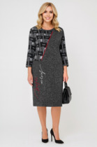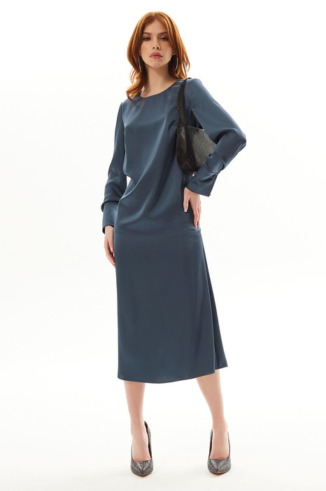 Платье полуприлегающего силуэта, без воротника, с круглым вырезом горловины, с застежкой на потайную молнию по среднему шву спинки. Перед с нагрудными вытачками. Спинка со средним швом. Рукав втачной, длинный, с отрезной манжетой, застегивающейся на одну петлю и пуговицу.