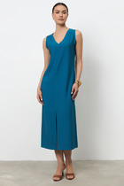 Свободное платье-свитер прямого покроя с разрезом по детали переда с левой стороны. Линия плеча спущенная с втачным рукавом прямого покроя стандартной длины. Вырез горловины округлый со свитерным воротником.