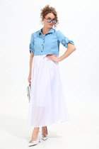 Элегантное женское платье полуприлегающего силуэта, классической длины, отрезное по линии талии со сборкой, изготовлено из хлопковой джинсовой ткани. Горловина оформлена рубашечным воротником со стойкой, центральная потайная  застежка планки на петли-пуговицы. Перед изделия с рельефами в верхней части и боковыми карманами по юбке, спинка с талиевыми вытачками. Рукава с цельнокроенным манжетом и декоративными пуговицами контрастного цвета. Можно снять пуговицы и ширина рукава по низу увеличится на 3см. В комплекте идет пояс из основной ткани. Платье будет комфортно для любого типа фигуры. Длина рукава – 46см, длина изделия – 103см.