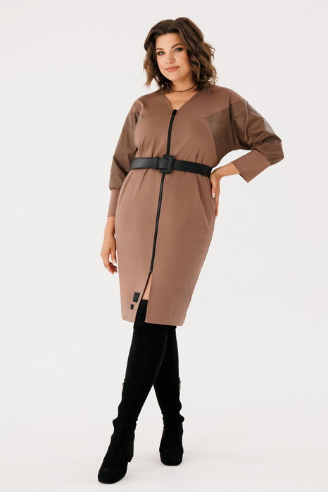 Платье полуприлегающего силуэта, вырез горловины V – образный, рукав цельнокроеный спущенный со вставками из кожи и на манжете внизу. По спинке кокетка, в боковых швах функциональные карманы. Застежка на тесьму-молнию. В комплекте ремень из экокожи.