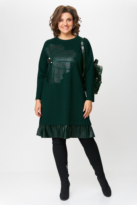 Платье свободного А-образного силуэта. Вырез горловины округлый, рукав спущенный, длинный. По низу изделия рюши из экокожи. Платье без застежки. Декором является аппликация-вышивка с пришивными бусинами из экокожи.