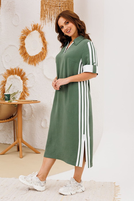 Платье свободного силуэта, вырез горловины с воротником и застежкой поло. Рукав втачной с манжетой и патой. Декором являются лампасы по боковым швам. В боковых швах разрезы. В комплекте съемный пояс из основной ткани. Изделие без застежки.