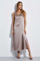 Платье женское прямого силуэта из шифона на подкладке с антистатистическим эффектом и цельнокроенными рукавами. Платье отрезное по линии талии, где вставлена резинка для создания напуска, по бокам декоративные разрезы. Уход за изделиями из шифона: