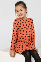 Платье А-образного силуэта, с длинными втачными рукавами на манжетах. Изделие выполнено из полотен контрастных цветов, полочка имеет вставку на которой выполнен принт, рукава с широким настрочным лампасом. Горловина круглая и оформлена воротом-трубой.