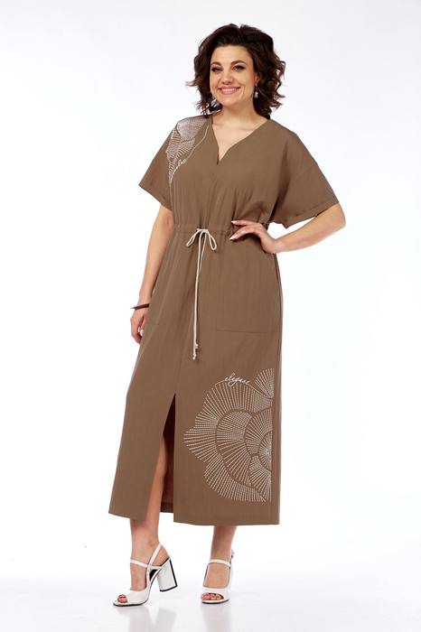 Платье женское, прямого силуэта из плательной ткани. Горловина фигурной формы. По переду средний шов с разрезом внизу. Платье отрезное по талии с кулисой. Обработаны накладные карманы. Рукава спущенные. По спинке кокетка с декоративным элементом и средний шов. Платье декорировано печатью.
