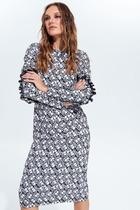 Платье женское прямого силуэта, изготовлено из трикотажного полотна и атласа. Платье отрезное ниже линии талии, со вставкой имитирующей пояс из отделочной ткани, с кулисой и втянутым шнуром. Горловина круглой формы с отделочным кантом. В нижней части платья обработан элемент с эффектом запаха. Обработаны карманы. Рукава втачные, длинные. Спинка разрезная с фигурным низом.