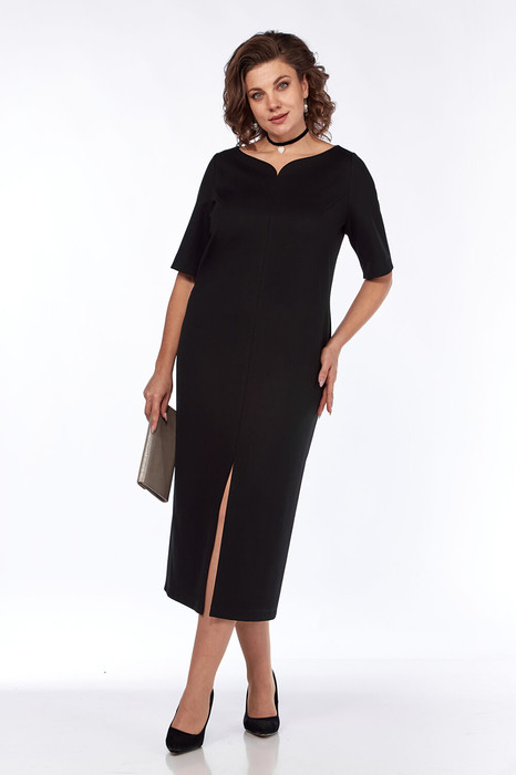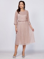 Платье женское, нарядное, полуприлегающего силуэта выполнено из фактурного трикотажного полотна премиум-класса. Горловина фигурной формы. Перед с нагрудными вытачками и средним швом в котором обработан разрез. Спинка со средним швом. Рукава втачные, одношовные с небольшим разрезом по шву.