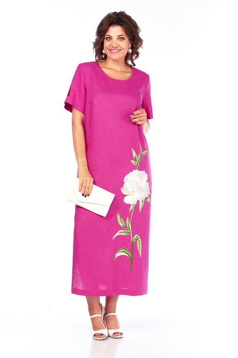 "Платье женское прямого силуэта, изготовлено из натуральной ткани. Горловина круглой формы. По переду обработаны нагрудные вытачки. На спинке средний шов. В боковых швах обработаны карманы, внизу разрезы. Рукава втачные, разрезные с фигурным вырезом. Платье декорировано дизайнерской вышивкой.