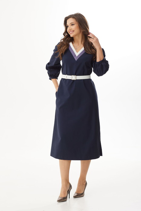 Платье женское прямого силуэта с рукавом покроя реглан. Перед цельнокроеный. Спинка цельнокроеная. Горловина V-образной формы, обработана планками контрастного цвета. В боковых швах обработаны карманы, слева разрез. Рукав объемный, декорирован защипами, по низу обработан узкой манжетой. Пояс в комплект не входит. Декоративные элементы и фурнитура могут отличаться от заявленных на фото.
