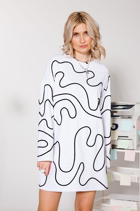 Свободное платье с контрастной абстрактной вышивкой мягким шнуром — одна из самых уютных моделей для повседневного гардероба и отличная пара для повседневных образов. Мы выбрали для него плотный трикотаж из хлопка без начеса с особенно прочными и устойчивыми к деформации волокнами. А значит, платье будет выглядеть как новое даже через несколько сезонов. Длина - 82 см.