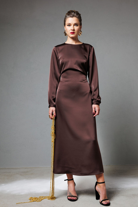 Прямое платье длиной в пол.  Застежка по спинке на петлю-пуговицу. Эффектное платье простого силуэта. В комплекте идет пояс, которым можно подчеркнуть линию талии завязав его на спинке. Длина платья - 129 см.