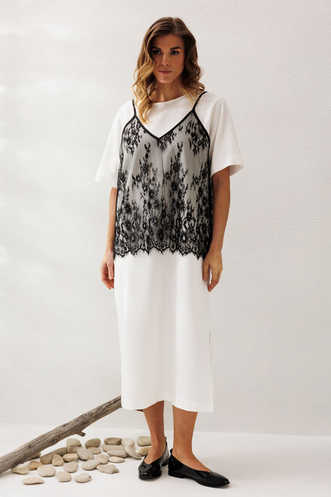 Платье свободного прямого силуэта из трикотажного полотна с втачным укороченным рукавом длиной 27 см. В боковом шве присутствует разрез, высотой 39 см. Горловина в форме округлой «лодочки», оформлена окантовочной планкой, шириной 1 см. Длина платья по спинке 116 см. Эффектным дополнением изделия выступает ажурная майка-накидка на бретелях. Спереди майка имеет V-образную форму горловины, на спинке горизонтальную линию. Срезы майки обработаны окантовочной тесьмой 0,7 см. Длина ажурной майки 60 см.