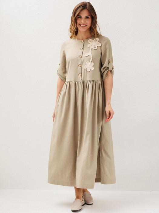 Восхитительное платье свободного силуэта с отрезной линией талии и рукавом укороченной длины. Полочка и спинка платья отрезные по линии талии. Спереди расположены наклонные горизонтальные нагрудные вытачки и фронтально-вертикальная бортовая застежка на петли/пуговицы. Декоративным элементом выступает настрочная ассиметричная вязанная нашивка в виде цветка. Горловина округлой формы. Спинка имеет отрезную горизонтальную кокетку. Рукав втачной, с предполагаемым отворотом, который поддерживает пата. Пата может быть закреплена на пуговицу (29 см). Длина рукава без паты 43 см. Юбка платья А-силуэта. По линии талии умеренная сборка. В боковых швах расположены внутренние карманы и разрезы, высотой 30 см. Длина платья по спинке 123-129 см (в зависимости от размерного ряда).