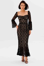 Платье выполнено из струящейся ткани с люрексом. Платье свободного силуэта. Горловина округлой формы обработана обтачкой. Рукав втачной, расклешённый к низу. По переду платья нагрудные выточки.