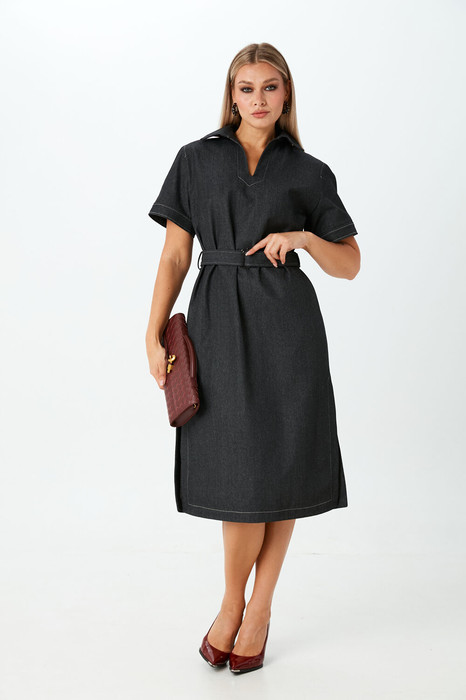 Платье свободного объёма прямого силуэта из плотной джинсовой ткани. Длина платья ниже колена, по бокам разрезы. Горловина V-образная, воротник платья рубашечного типа. В комплекте к платью идёт пояс.