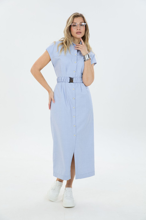 Платье умеренного объёма со спущенной линией плеча длиной ниже колена. Застёжка по переду на петли и пуговицы переходящая в разрез. Воротник отложной. По талии съёмный эластичный пояс.