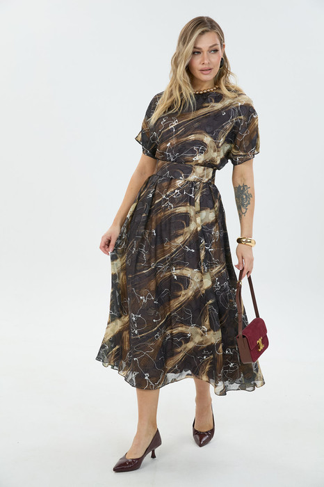 Платье длины "миди" с объёмной юбкой выполнено из лёгкой ткани с принтом. Застежка на потайную молнию по среднему шву спинки. В комплекте идет длинный съемный пояс. На юбке по линии талии заложены складки.