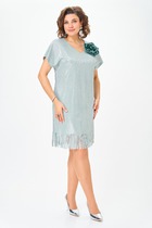 Платье приталенного силуэта выполнено из плотного трикотажного полотна. Перед платья декорирован сеткой с вышивкой из пайеток. По спинке расположены талиевые вытачки. По среднему шву спинки разрез длинной 56 см и застежка на потайную молнию. Горловина и пройма обтачные, рукав выполнен в виде небольшого "крылышка".