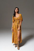 Платье свободного кроя в стиле "Бохо". Рукав реглан, по низу рукава манжеты на застёжку петлю и пуговицу. У- образный вырез горловины. По переду косые подрезы, по спинке средний шов низ платья собран на резинку.