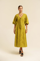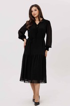 Платье полуприлегающего силуэта, отрезное по талии. Рукав втачной, по низу рукава манжета с застежкой на петли и пуговицы. Воротник рубашечного кроя, по переду